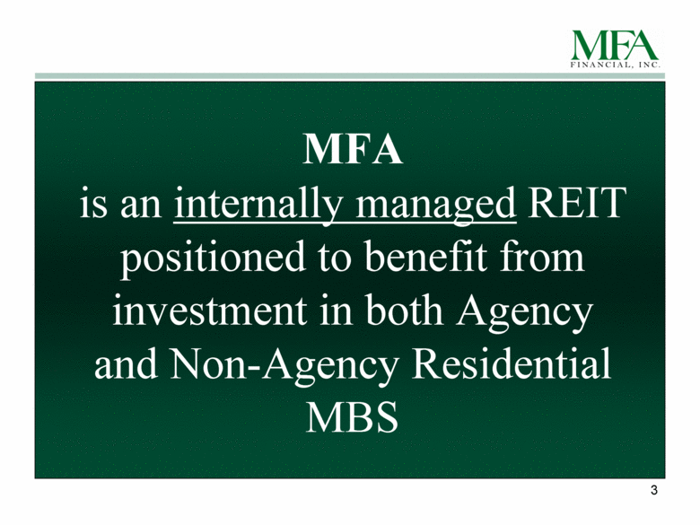 2 When used in this presentation or other written or oral communications, statements that are not historical in nature, including those containing words such as will, believe, expect, anticipate, estimate, plan, continue, intend, should, could, would, may or similar expressions, are intended to identify forward-looking statements for purposes of Section 27A of the Securities Act of 1933, as amended, and Section 21E of the Securities Exchange Act of 1934, as amended, and, as such, may involve known and unknown risks, uncertainties and assumptions. These forward-looking statements include information about possible or assumed future results with respect to our business, financial condition, liquidity, results of operations, plans and objectives. Statements regarding the following subjects, among others, may be forward-looking: changes in interest rates and the market value of MFAs MBS; changes in the prepayment rates on the mortgage loans securing MFAs MBS; MFAs ability to borrow to finance its assets; implementation of or changes in government regulations or programs affecting MFAs business; MFAs ability to maintain its qualification as a REIT for federal income tax purposes; MFAs ability to maintain its exemption from registration under the Investment Company Act of 1940, including statements regarding the Concept Release issued by the Securities and Exchange Commission relating to interpretive issues under the 1940 Act with respect to the status under the 1940 Act of companies that are engaged in the business of acquiring mortgages and mortgage-related interests; and risks associated with investing in real estate assets, including changes in business conditions and the general economy. These and other risks, uncertainties and factors, including those described in the annual, quarterly and/or current reports that MFA files with the SEC, could cause MFAs actual results to differ materially from those projected in any forward-looking statements that it makes. These forward-looking statements are based on beliefs, assumptions and expectations of MFAs future performance, taking into account all information currently available. Readers are cautioned not to place undue reliance on these forward-looking statements, which speak only as of the date on which they are made. New risks and uncertainties arise over time and it is not possible to predict those events or how they may affect MFA. Except as required by law, MFA is not obligated to, and does not intend to, update or revise any forward-looking statements, whether as a result of new information, future events or otherwise. Forward Looking Statements |