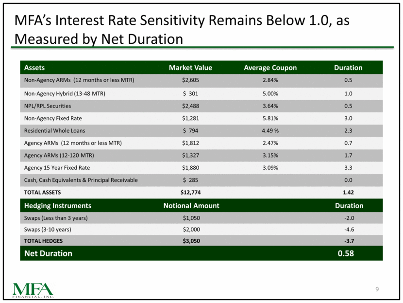 Distributable Income / Items Expected to Impact Future Taxable Income 8 As of September 30, 2015 MFA had undistributed REIT taxable income of $0.04 per share. Items that we anticipate may significantly impact future taxable income (though not GAAP income) over the next quarters include: Re-securitization unwind anticipated in 2016 is expected to increase taxable income by an amount estimated in excess of $0.15 per share. Countrywide Settlement (expected payment within next two quarters) is expected to increase taxable income. Estimated impact approximately $0.05 per share.