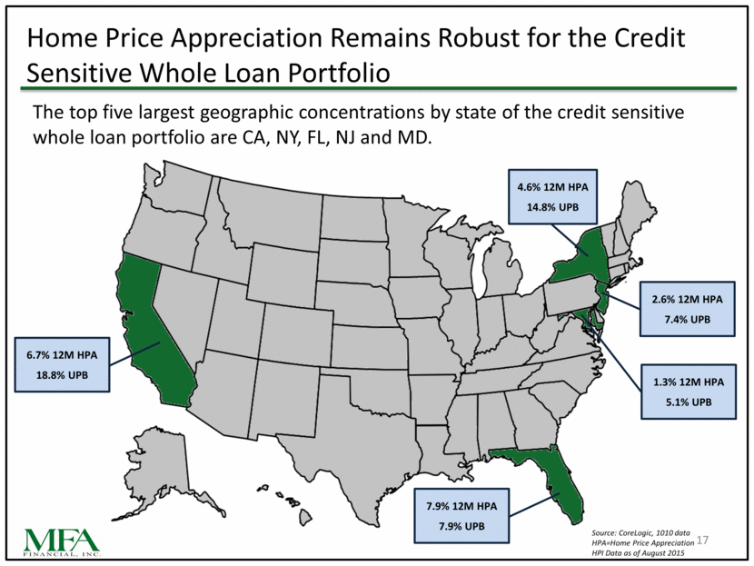 14 MFA Portfolio Top 5 Florida County Concentrations County % of MFA Legacy Non-Agency MBS Portfolio 12 Month Home Price Appreciation Miami-Dade 1.2% + 8.31% Broward 1.1% + 5.58% Palm Beach 0.8% + 7.58% Orange 0.5% + 5.47% Hillsborough 0.4% + 7.02% Florida makes up MFAs second largest Legacy Non-Agency MBS geographic concentration with 7.5% of the portfolio Improving Credit: Home Price Appreciation Drives LTVs Down 1.2% of portfolio 1.1% of portfolio 0.8% of portfolio 0.4% of portfolio 0.5% of portfolio Source: CoreLogic, 1010 data HPA=Home Price Appreciation HPI Data as of August 2015