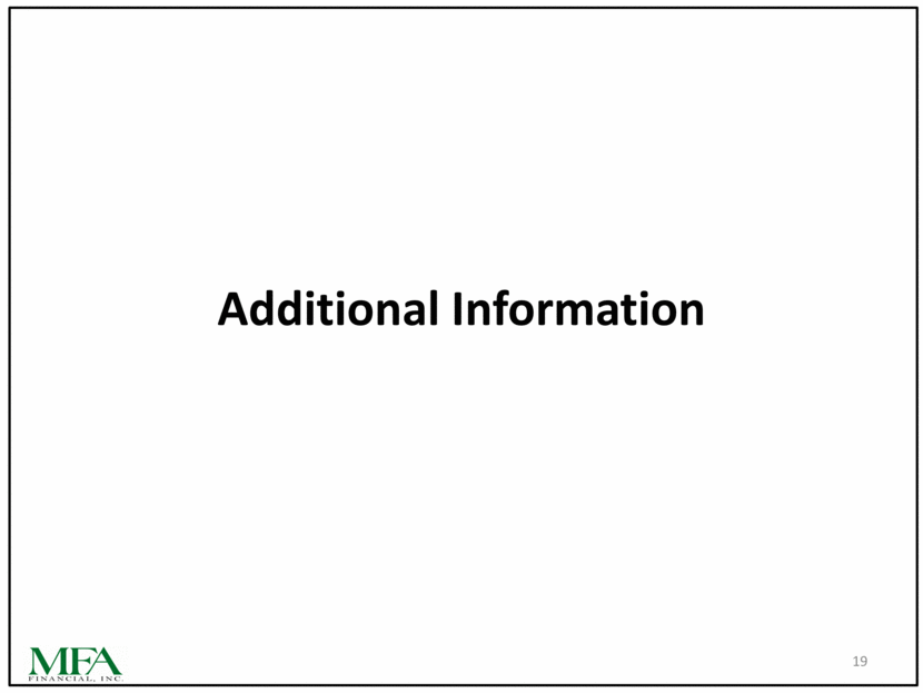 Summary 18 We continue to utilize our expertise to identify and acquire attractive credit sensitive residential mortgage assets. We have substantially grown our holdings of RPL/NPL mortgage loans in 2015. Our credit sensitive assets continue to perform well. Future Federal Reserve decisions on monetary policy will remain dependent on incoming data. MFA is well positioned for changes in monetary policy and/or interest rates.