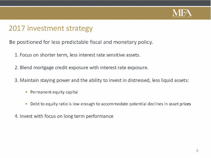 Executive summary Through volatile markets and both interest rate generated strong long term returns to investors and credit cycles, MFA has (1) As of 3/31/17 assuming reinvestment of dividends. 4 Time PeriodAnnualized MFA Shareholder Return (1) Since January 1, 200015.4% 10 Year13.8% 5 Year15.7% 1 Year31.0%