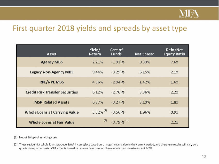 MFAs yields and spreads remain attractive Despite six Fed Funds rate increases in two and a half years: MFAs interest rate spread is relatively unchanged and remains attractive. Yields on many of our credit sensitive assets have risen as credit fundamentals have continued to improve. We have successfully identified higher yielding assets in a rising rate environment. Funding costs have risen more slowly than Fed Funds. 6% 5% 4% 3% 2% 1% 0% Q3 '15 Q4 '15 Q1 '16 Q2 '16 Q3 '16 Q4 '16 Q1 '17 Q2 '17 Q3 '17 Q4 '17 Q118 9 Yield (%)
