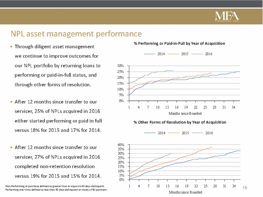 NPL asset management performance % Performing or Paid-in-Full by Year of Acquisition Through diligent asset management we continue to improve outcomes for our NPL portfolio by returning loans to performing or paid-in-full status, and through other forms of resolution. 2014 2015 2016 30% 25% 20% 15% 10% 5% 0% After 12 months since transfer to our servicer, 25% of NPLs acquired in 2016 either started performing or paid in full versus 18% for 2015 and 17% for 2014. 1 4 7 10 13 16 19 22 25 28 31 34 Months since Boarded % Other Forms of Resolution by Year of Acquisition 2014 2015 2016 40% 35% 30% 25% 20% 15% 10% 5% 0% After 12 months since transfer to our servicer, 27% of NPLs acquired in 2016 completed non-retention resolution versus 19% for 2015 and 15% for 2014. 1 4 7 10 13 16 19 22 25 28 31 34 Non-Performing at purchase defined as greater than or equal to 60 days delinquent. Performing over time defined as less than 60 days delinquent or made a P&I payment. 16 Months since Boarded