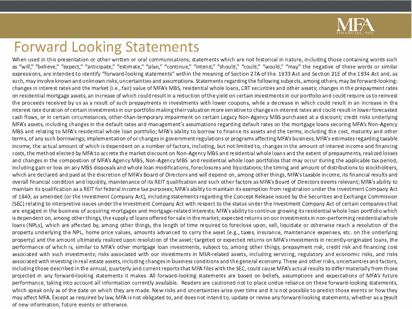 Forward Looking Statements When used in this presentation or other written or oral communications, statements which are not historical in nature, including those containing words such as will, believe, expect, anticipate, estimate, plan, continue, intend, should, could, would, may the negative of these words or similar expressions, are intended to identify forward-looking statements within the meaning of Section 27A of the 1933 Act and Section 21E of the 1934 Act and, as such, may involve known and unknown risks, uncertainties and assumptions. Statements regarding the following subjects, among others, may be forward-looking: changes in interest rates and the market (i.e., fair) value of MFAs MBS, residential whole loans, CRT securities and other assets; changes in the prepayment rates on residential mortgage assets, an increase of which could result in a reduction of the yield on certain investments in our portfolio and could require us to reinvest the proceeds received by us as a result of such prepayments in investments with lower coupons, while a decrease in which could result in an increase in the interest rate duration of certain investments in our portfolio making their valuation more sensitive to changes in interest rates and could result in lower forecasted cash flows, or in certain circumstances, other-than-temporary impairment on certain Legacy Non-Agency MBS purchased at a discount; credit risks underlying MFAs assets, including changes in the default rates and managements assumptions regarding default rates on the mortgage loans securing MFAs Non-Agency MBS and relating to MFAs residential whole loan portfolio; MFAs ability to borrow to finance its assets and the terms, including the cost, maturity and other terms, of any such borrowings; implementation of or changes in government regulations or programs affecting MFAs business; MFAs estimates regarding taxable income, the actual amount of which is dependent on a number of factors, including, but not limited to, changes in the amount of interest income and financing costs, the method elected by MFA to accrete the market discount on Non-Agency MBS and residential whole loans and the extent of prepayments, realized losses and changes in the composition of MFAs Agency MBS, Non-Agency MBS and residential whole loan portfolios that may occur during the applicable tax period, including gain or loss on any MBS disposals and whole loan modifications, foreclosures and liquidations; the timing and amount of distributions to stockholders, which are declared and paid at the discretion of MFAs Board of Directors and will depend on, among other things, MFAs taxable income, its financial results and overall financial condition and liquidity, maintenance of its REIT qualification and such other factors as MFAs Board of Directors deems relevant; MFAs ability to maintain its qualification as a REIT for federal income tax purposes; MFAs ability to maintain its exemption from registration under the Investment Company Act of 1940, as amended (or the Investment Company Act), including statements regarding the Concept Release issued by the Securities and Exchange Commission (SEC) relating to interpretive issues under the Investment Company Act with respect to the status under the Investment Company Act of certain companies that are engaged in the business of acquiring mortgages and mortgage-related interests; MFAs ability to continue growing its residential whole loan portfolio which is dependent on, among other things, the supply of loans offered for sale in the market; expected returns on our investments in non-performing residential whole loans (NPLs), which are affected by, among other things, the length of time required to foreclose upon, sell, liquidate or otherwise reach a resolution of the property underlying the NPL, home price values, amounts advanced to carry the asset (e.g., taxes, insurance, maintenance expenses, etc. on the underlying property) and the amount ultimately realized upon resolution of the asset; targeted or expected returns on MFAs investments in recently-originated loans, the performance of which is, similar to MFAs other mortgage loan investments, subject to, among other things, prepayment risk, credit risk and financing cost associated with such investments; risks associated with our investments in MSR-related assets, including servicing, regulatory and economic risks, and risks associated with investing in real estate assets, including changes in business conditions and the general economy. These and other risks, uncertainties and factors, including those described in the annual, quarterly and current reports that MFA files with the SEC, could cause MFAs actual results to differ materially from those projected in any forward-looking statements it makes. All forward-looking statements are based on beliefs, assumptions and expectations of MFAs future performance, taking into account all information currently available. Readers are cautioned not to place undue reliance on these forward-looking statements, which speak only as of the date on which they are made. New risks and uncertainties arise over time and it is not possible to predict those events or how they may affect MFA. Except as required by law, MFA is not obligated to, and does not intend to, update or revise any forward-looking statements, whether as a 2result of new information, future events or otherwise.