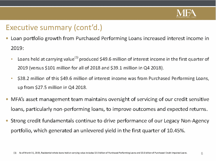 Executive summary (contd.) First quarter investment activity was very robust as we purchased approximately $1.2 billion of assets and increased our portfolio by $369 million during the quarter. We added over $875 million of Purchased Performing Loans.(1) We continue to pursue new investment structures to strengthen our originator relationships and gain access to loan flow. We purchased an additional $220 million of MSR-related assets in the first quarter. (1) Purchased Performing Loans are comprised of Non-QM loans, Fix and Flip Loans, Single Family Rental Loans and Seasoned Performing Loans. They are included, along with Purchased Credit Impaired Loans, in Residential whole loans held at carrying value on our consolidated balance sheet. 5