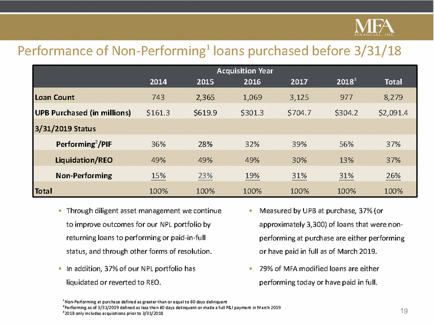 RPL portfolio delinquency characteristics as of 3/31/2019 86% of our RPL portfolio is less than 60 days delinquent. On average, 27% of the 60+ days delinquent loans are making payments. Prepayment speeds have outperformed expectations maintaining a range between 6% and 14%. 18