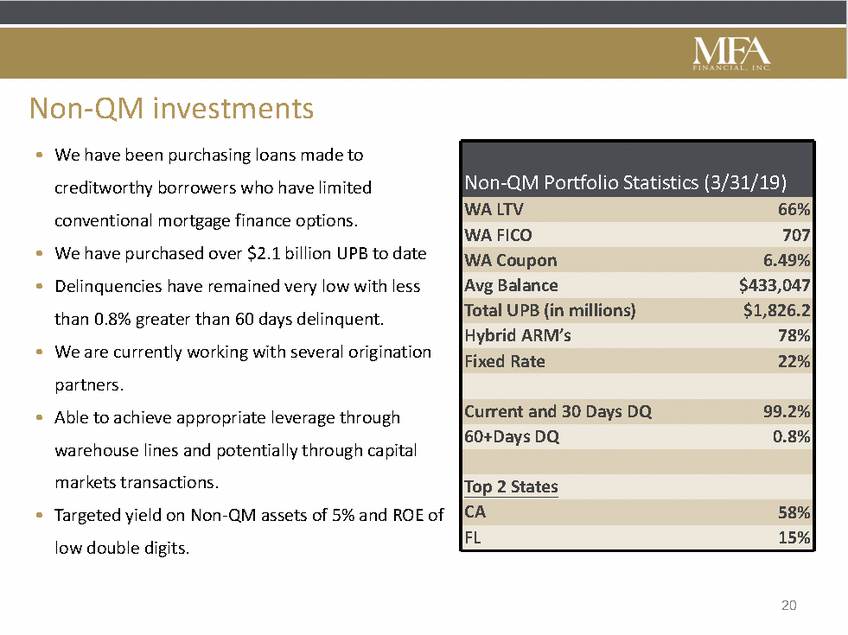 Non-Performing1 Performance of loans purchased before 3/31/18 Through diligent asset management we continue to improve outcomes for our NPL portfolio by returning loans to performing or paid-in-full status, and through other forms of resolution. Measured by UPB at purchase, 37% (or approximately 3,300) of loans that were non-performing at purchase are either performing or have paid in full as of March 2019. In addition, 37% of our NPL portfolio has liquidated or reverted to REO. 79% of MFA modified loans are either performing today or have paid in full. 1Non-Performing at purchase defined as greater than or equal to 60 days delinquent 2Performing as of 3/31/2019 defined as less than 60 days delinquent or made a full P&I payment in March 2019 32018 only includes acquisitions prior to 3/31/2018 19 Acquisition Year 201420152016201720183Total Loan Count7432,3651,0693,1259778,279 UPB Purchased (in millions)$161.3$619.9$301.3$704.7$304.2$2,091.4 3/31/2019 Status Performing2/PIF36%28%32%39%56%37% Liquidation/REO49%49%49%30%13%37% Non-Performing15% 23% 19% 31% 31% 26% Total100%100%100%100%100%100%