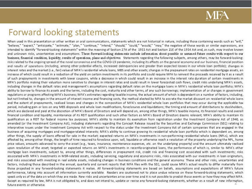 Forward looking statements When used in this presentation or other written or oral communications, statements which are not historical in nature, including those containing words such as “will,” “believe,” “expect,” “anticipate,” “estimate,” “plan,” “continue,” “intend,” “should,” “could,” “would,” “may,” the negative of these words or similar expressions, are intended to identify “forward-looking statements” within the meaning of Section 27A of the 1933 Act and Section 21E of the 1934 Act and, as such, may involve known and unknown risks, uncertainties and assumptions. These forward-looking statements include information about possible or assumed future results with respect to our business, financial condition, liquidity, results of operations, plans and objectives. Statements regarding the following subjects, among others, may be forward-looking: risks related to the ongoing spread of the novel coronavirus and the COVID-19 pandemic, including its effects on the general economy and our business, financial position and results of operations (including, among other potential effects, increased delinquencies and greater than expected losses in our whole loan portfolio); changes in interest rates and the market (i.e., fair) value of MFA’s residential whole loans, MBS and other assets; changes in the prepayment rates on residential mortgage assets, an increase of which could result in a reduction of the yield on certain investments in its portfolio and could require MFA to reinvest the proceeds received by it as a result of such prepayments in investments with lower coupons, while a decrease in which could result in an increase in the interest rate duration of certain investments in MFA’s portfolio making their valuation more sensitive to changes in interest rates and could result in lower forecasted cash flows, credit risks underlying MFA’s assets, including changes in the default rates and management’s assumptions regarding default rates on the mortgage loans in MFA’s residential whole loan portfolio; MFA’s ability to borrow to finance its assets and the terms, including the cost, maturity and other terms, of any such borrowings; implementation of or changes in government regulations or programs affecting MFA’s business; MFA’s estimates regarding taxable income, the actual amount of which is dependent on a number of factors, including, but not limited to, changes in the amount of interest income and financing costs, the method elected by MFA to accrete the market discount on residential whole loans and the extent of prepayments, realized losses and changes in the composition of MFA’s residential whole loan portfolios that may occur during the applicable tax period, including gain or loss on any MBS disposals and whole loan modifications, foreclosures and liquidations; the timing and amount of distributions to stockholders, which are declared and paid at the discretion of MFA’s Board of Directors and will depend on, among other things, MFA’s taxable income, its financial results and overall financial condition and liquidity, maintenance of its REIT qualification and such other factors as MFA’s Board of Directors deems relevant; MFA’s ability to maintain its qualification as a REIT for federal income tax purposes; MFA’s ability to maintain its exemption from registration under the Investment Company Act of 1940, as amended (or the Investment Company Act), including statements regarding the Concept Release issued by the Securities and Exchange Commission (SEC) relating to interpretive issues under the Investment Company Act with respect to the status under the Investment Company Act of certain companies that are engaged in the business of acquiring mortgages and mortgage-related interests; MFA’s ability to continue growing its residential whole loan portfolio which is dependent on, among other things, the supply of loans offered for sale in the market; expected returns on MFA’s investments in non-performing residential whole loans (NPLs), which are affected by, among other things, the length of time required to foreclose upon, sell, liquidate or otherwise reach a resolution of the property underlying the NPL, home price values, amounts advanced to carry the asset (e.g., taxes, insurance, maintenance expenses, etc. on the underlying property) and the amount ultimately realized upon resolution of the asset; targeted or expected returns on MFA’s investments in recently-originated loans, the performance of which is, similar to MFA’s other mortgage loan investments, subject to, among other things, differences in prepayment risk, credit risk and financing cost associated with such investments; risks associated with MFA’s investments in MSR-related assets, including servicing, regulatory and economic risks, risks associated with our investments in loan originators, and risks associated with investing in real estate assets, including changes in business conditions and the general economy. These and other risks, uncertainties and factors, including those described in the annual, quarterly and current reports that MFA files with the SEC, could cause MFA’s actual results to differ materially from those projected in any forward-looking statements it makes. All forward-looking statements are based on beliefs, assumptions and expectations of MFA’s future performance, taking into account all information currently available. Readers are cautioned not to place undue reliance on these forward-looking statements, which speak only as of the date on which they are made. New risks and uncertainties arise over time and it is not possible to predict those events or how they may affect MFA. Except as required by law, MFA is not obligated to, and does not intend to, update or revise any forward-looking statements, whether as a result of new infor future events or otherwise. mation, 2 |