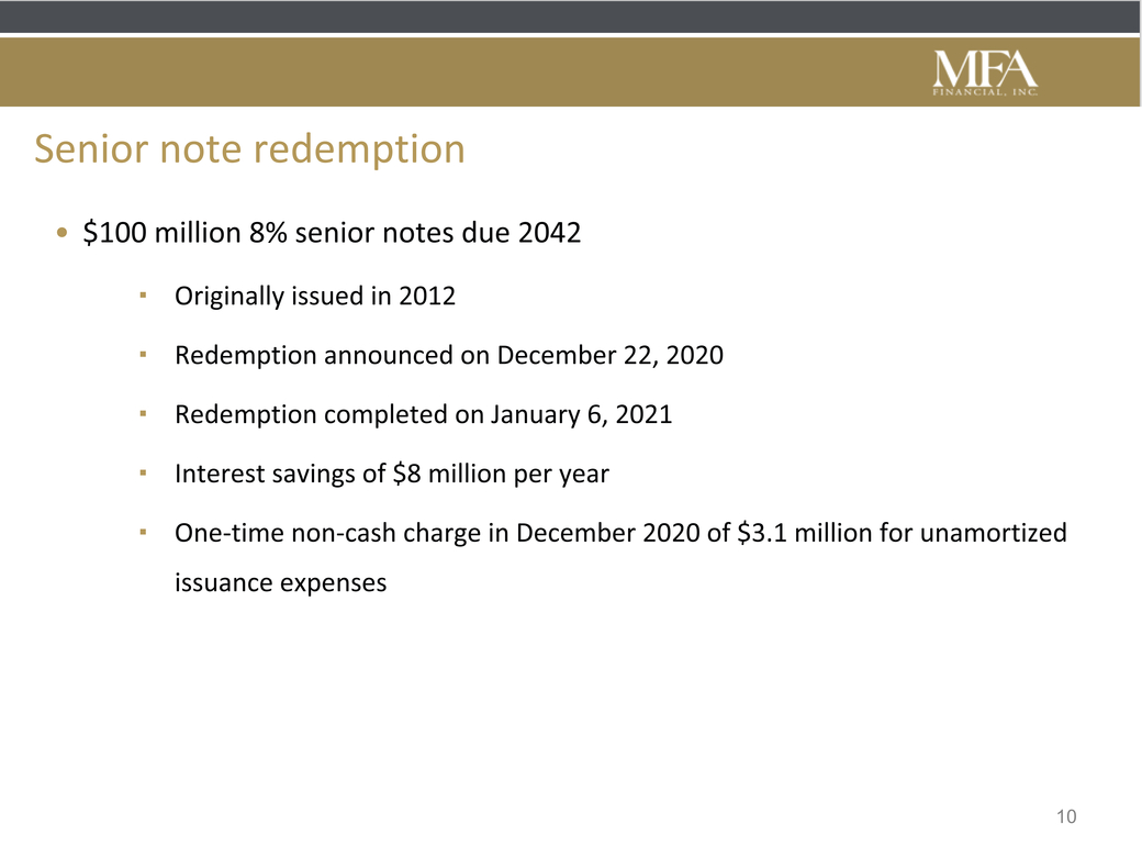 Forward looking statements When used in this presentation or other written or oral communications, statements which are not historical in nature, including those containing words such as “will,” “believe,” “expect,” “anticipate,” “estimate,” “plan,” “continue,” “intend,” “should,” “could,” “would,” “may,” the negative of these words or similar expressions, are intended to identify “forward-looking statements” within the meaning of Section 27A of the Securities Act of 1933, as amended, and Section 21E of the Securities Exchange Act of 1934, as amended, and, as such, may involve known and unknown risks, uncertainties and assumptions. These forward-looking statements include information about possible or assumed future results with respect to our business, financial condition, liquidity, results of operations, plans and objectives. Statements regarding the following subjects, among others, may be forward-looking: risks related to the ongoing spread of the novel coronavirus and the COVID-19 pandemic, including the pandemic’s effect on the general economy and our business, financial position and results of operations (including, among other potential effects, increased delinquencies and greater than expected losses in our whole loan portfolio); changes in interest rates and the market (i.e., fair) value of MFA’s residential whole loans, MBS and other assets; changes in the prepayment rates on residential mortgage assets, an increase of which could result in a reduction of the yield on certain investments in its portfolio and could require MFA to reinvest the proceeds received by it as a result of such prepayments in investments with lower coupons, while a decrease in which could result in an increase in the interest rate duration of certain investments in MFA’s portfolio making their valuation more sensitive to changes in interest rates and could result in lower forecasted cash flows; credit risks underlying MFA’s assets, including changes in the default rates and management’s assumptions regarding default rates on the mortgage loans in MFA’s residential whole loan portfolio; MFA’s ability to borrow to finance its assets and the terms, including the cost, maturity and other terms, of any such borrowings; implementation of or changes in government regulations or programs affecting MFA’s business; MFA’s estimates regarding taxable income, the actual amount of which is dependent on a number of factors, including, but not limited to, changes in the amount of interest income and financing costs, the method elected by MFA to accrete the market discount on residential whole loans and the extent of prepayments, realized losses and changes in the composition of MFA’s residential whole loan portfolios that may occur during the applicable tax period, including gain or loss on any MBS disposals and whole loan modifications, foreclosures and liquidations; the timing and amount of distributions to stockholders, which are declared and paid at the discretion of MFA’s Board and will depend on, among other things, MFA’s taxable income, its financial results and overall financial condition and liquidity, maintenance of its REIT qualification and such other factors as MFA’s Board deems relevant; MFA’s ability to maintain its qualification as a REIT for federal income tax purposes; MFA’s ability to maintain its exemption from registration under the Investment Company Act of 1940, as amended (or the “Investment Company Act”), including statements regarding the concept release issued by the Securities and Exchange Commission (“SEC”) relating to interpretive issues under the Investment Company Act with respect to the status under the Investment Company Act of certain companies that are engaged in the business of acquiring mortgages and mortgage-related interests; MFA’s ability to continue growing its residential whole loan portfolio, which is dependent on, among other things, the supply of loans offered for sale in the market; expected returns on MFA’s investments in nonperforming residential whole loans (“NPLs”), which are affected by, among other things, the length of time required to foreclose upon, sell, liquidate or otherwise reach a resolution of the property underlying the NPL, home price values, amounts advanced to carry the asset (e.g., taxes, insurance, maintenance expenses, etc. on the underlying property) and the amount ultimately realized upon resolution of the asset; targeted or expected returns on MFA’s investments in recently-originated loans, the performance of which is, similar to MFA’s other mortgage loan investments, subject to, among other things, differences in prepayment risk, credit risk and financing cost associated with such investments; risks associated with MFA’s investments in MSR-related assets, including servicing, regulatory and economic risks, risks associated with our investments in loan originators, and risks associated with investing in real estate assets, including changes in business conditions and the general economy. These and other risks, uncertainties and factors, including those described in the annual, quarterly and current reports that MFA files with the SEC, could cause MFA’s actual results to differ materially from those projected in any forward-looking statements it makes. All forward-looking statements are based on beliefs, assumptions and expectations of MFA’s future performance, taking into account all information currently available. Readers are cautioned not to place undue reliance on these forward-looking statements, which speak only as of the date on which they are made. New risks and uncertainties arise over time and it is not possible to predict those events or how they may affect MFA. Except as required by law, MFA is not obligated to, and does not intend to, update or revise any forward-looking statements, whether as a result of new information, future