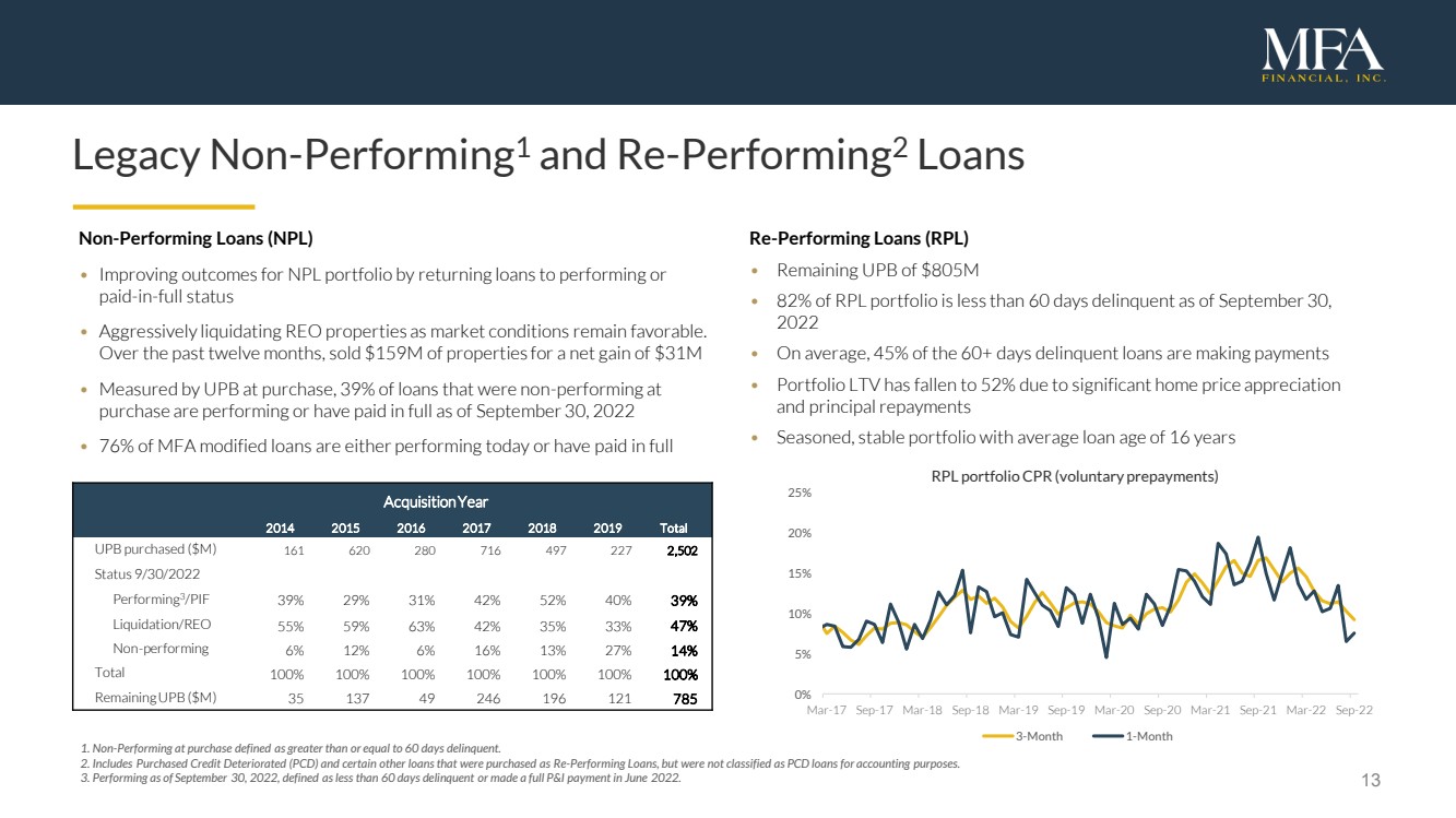 13 Legacy Non - Performing 1 and Re - Performing 2 Loans Non - Performing L oans (NPL) • I mprov ing outcomes for NPL portfolio by returning loans to performing or paid - in - full status • A ggressively liquidating REO properties as market conditions remain favorable. Over the past twelve months , sold $ 159M of properties for a net gain of $ 31M • Measured by UPB at purchase, 39% of loans that were non - performing at purchase are performing or have paid in full as of September 30, 2022 • 76% of MFA modified loans are either performing today or have paid in full Re - Performing Loans (RPL) • Remaining UPB of $ 8 05M • 8 2 % of RPL portfolio is less than 60 days delinquent as of September 30, 2022 • On average, 45 % of the 60+ days delinquent loans are making payments • Portfolio LTV has fallen to 5 2 % due to significant home price appreciation and principal repayments • Seasoned , stable portfolio with average loan age of 16 years 1. Non - P erforming at purchase defined as greater than or equal to 60 days delinquent .. 2. Includes Purchased Credit Deteriorated (PCD) and certain other loans that were purchased as Re - Performing L oans , but were not classified as PCD loans for accounting purposes. 3 .. Performing as of September 30, 2022, defined as less than 60 days delinquent or made a full P&I payment in June 2022 .. Acquisition Year 2014 2015 2016 2017 2018 2019 Total UPB p urchased ($ M ) 161 620 280 716 497 227 2,502 Status 9 /30/2022 Performing 3 /PIF 39% 29% 31% 42% 52% 40% 39% Liquidation/REO 55% 59% 63% 42% 35% 33% 47% Non - p erforming 6% 12% 6% 16% 13% 27% 14% Total 100% 100% 100% 100% 100% 100% 100% Remaining UPB ($ M ) 35 137 49 246 196 121 785 0% 5% 10% 15% 20% 25% Mar-17 Sep-17 Mar-18 Sep-18 Mar-19 Sep-19 Mar-20 Sep-20 Mar-21 Sep-21 Mar-22 Sep-22 RPL portfolio CPR (voluntary prepayments ) 3-Month 1-Month |