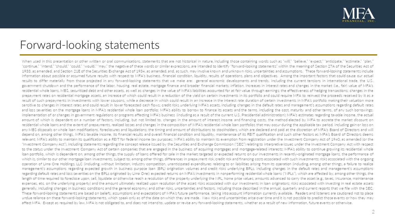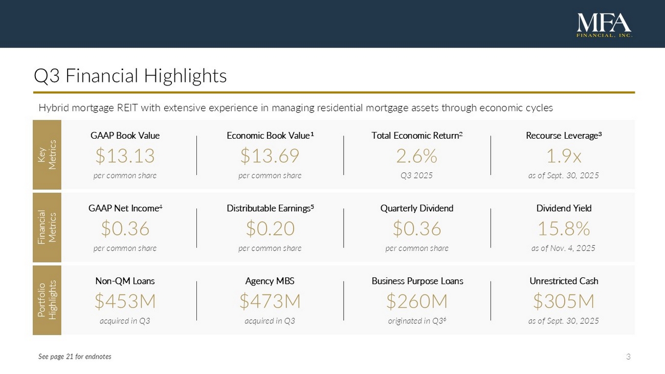 2 Q3 202 2 Financial Snapshot Forward - looking statements When used in this presentation or other written or oral communications, statements that are not historical in nature, including those containing words such as “will,” “believe,” “expect,” “anticipate,” “estimate,” “plan,” “continue,” “intend,” “should,” “could,” “would,” “may,” the negative of these words or similar expressions, are intended to identify “forward - looking statements” within the meaning of Section 27 A of the Securities Act of 1933 , as amended, and Section 21 E of the Securities Exchange Act of 1934 , as amended, and, as such, may involve known and unknown risks, uncertainties and assumptions . These forward - looking statements include information about possible or assumed future results with respect to MFA’s business, financial condition, liquidity, results of operations, plans and objectives . Among the important factors that could cause our actual results to differ materially from those projected in any forward - looking statements that we make are : general economic developments and trends, including the current tensions in international trade, the U . S . government shutdown and the performance of the labor, housing, real estate, mortgage finance and broader financial markets ; inflation, increases in interest rates and changes in the market (i . e . , fair) value of MFA’s residential whole loans, MBS, securitized debt and other assets, as well as changes in the value of MFA’s liabilities accounted for at fair value through earnings ; the effectiveness of hedging transactions ; changes in the prepayment rates on residential mortgage assets, an increase of which could result in a reduction of the yield on certain investments in its portfolio and could require MFA to reinvest the proceeds received by it as a result of such prepayments in investments with lower coupons, while a decrease in which could result in an increase in the interest rate duration of certain investments in MFA’s portfolio making their valuation more sensitive to changes in interest rates and could result in lower forecasted cash flows ; credit risks underlying MFA’s assets, including changes in the default rates and management’s assumptions regarding default rates and loss severities on the mortgage loans in MFA’s residential whole loan portfolio ; MFA’s ability to borrow to finance its assets and the terms, including the cost, maturity and other terms, of any such borrowings ; implementation of or changes in government regulations or programs affecting MFA’s business (including as a result of the current U . S . Presidential administration) ; MFA’s estimates regarding taxable income, the actual amount of which is dependent on a number of factors, including, but not limited to, changes in the amount of interest income and financing costs, the method elected by MFA to accrete the market discount on residential whole loans and the extent of prepayments, realized losses and changes in the composition of MFA’s residential whole loan portfolios that may occur during the applicable tax period, including gain or loss on any MBS disposals or whole loan modifications, foreclosures and liquidations ; the timing and amount of distributions to stockholders, which are declared and paid at the discretion of MFA’s Board of Directors and will depend on, among other things, MFA’s taxable income, its financial results and overall financial condition and liquidity, maintenance of its REIT qualification and such other factors as MFA’s Board of Directors deems relevant ; MFA’s ability to maintain its qualification as a REIT for federal income tax purposes ; MFA’s ability to maintain its exemption from registration under the Investment Company Act of 1940 , as amended (or the “Investment Company Act”), including statements regarding the concept release issued by the Securities and Exchange Commission (“SEC”) relating to interpretive issues under the Investment Company Act with respect to the status under the Investment Company Act of certain companies that are engaged in the business of acquiring mortgages and mortgage - related interests ; MFA’s ability to continue growing its residential whole loan portfolio, which is dependent on, among other things, the supply of loans offered for sale in the market ; targeted or expected returns on our investments in recently - originated mortgage loans, the performance of which is, similar to our other mortgage loan investments, subject to, among other things, differences in prepayment risk, credit risk and financing costs associated with such investments ; risks associated with the ongoing operation of Lima One Holdings, LLC (including, without limitation, industry competition, unanticipated expenditures relating to or liabilities arising from its operation (including, among other things, a failure to realize management’s assumptions regarding expected growth in business purpose loan (BPL) origination volumes and credit risks underlying BPLs, including changes in the default rates and management’s assumptions regarding default rates and loss severities on the BPLs originated by Lima One) ; expected returns on MFA’s investments in nonperforming residential whole loans (“NPLs”), which are affected by, among other things, the length of time required to foreclose upon, sell, liquidate or otherwise reach a resolution of the property underlying the NPL, home price values, amounts advanced to carry the asset (e . g . , taxes, insurance, maintenance expenses, etc . on the underlying property) and the amount ultimately realized upon resolution of the asset ; risks associated with our investments in loan originators ; risks associated with investing in real estate assets generally, including changes in business conditions and the general economy ; and other risks, uncertainties and factors, including those described in the annu