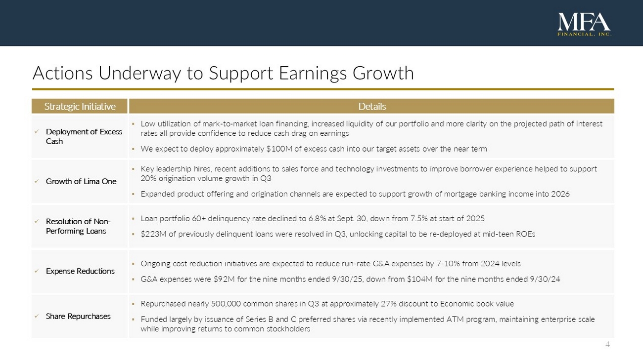 3 Q3 202 2 Financial Snapshot Hybrid mortgage REIT with extensive experience in managing residential mortgage assets through economic cycles See page 21 for endnotes Q3 Financial Highlights GAAP Book Value $13.13 per common share Economic Book Value 1 $13.69 per common share Total Economic Return 2 2 .6% Q3 2025 Recourse Leverage 3 1.9x as of Sept. 30, 2025 Key Metrics GAAP Net Income 4 $0.36 per common share Distributable Earnings 5 $0.20 per common share Quarterly Dividend $0.36 per common share Dividend Yield 15.8% as of Nov. 4 , 2025 Financial Metrics Non - QM Loans $453M acquired in Q3 Agency MBS $473M acquired in Q3 Business Purpose Loans $260M originated in Q3 6 Unrestricted Cash $305M as of Sept. 30, 2025 Portfolio Highlights