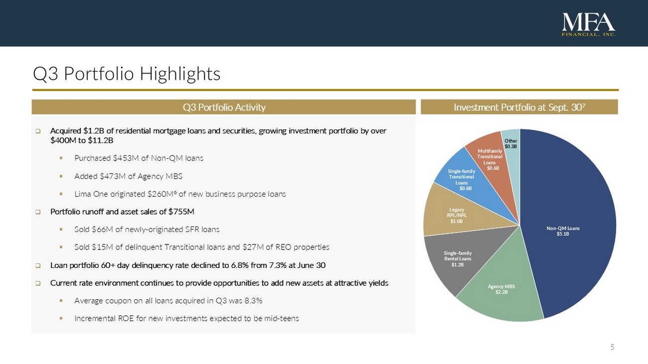 4 Actions Underway to Support Earnings Growth Strategic Initiative x Deployment of Excess Cash ▪ Loan portfolio 60+ delinquency rate declined to 6.8% at Sept. 30, down from 7.5% at start of 2025 ▪ $223M of previously delinquent loans were resolved in Q3, unlocking capital to be re - deployed at mid - teen ROEs ▪ Ongoing cost reduction initiatives are expected to reduce run - rate G&A expenses by 7 - 10% from 2024 levels ▪ G&A expenses were $92M for the nine months ended 9/30/25, down from $104M for the nine months ended 9/30/24 ▪ Repurchased nearly 500,000 common shares in Q3 at approximately 27% discount to Economic book value ▪ Funded largely by issuance of Series B and C preferred shares via recently implemented ATM program, maintaining enterprise sc ale while improving returns to common stockholders ▪ Key leadership hires, recent additions to sales force and technology investments to improve borrower experience helped to sup por t 20% origination volume growth in Q3 ▪ Expanded product offering and origination channels are expected to support growth of mortgage banking income into 2026 Details x Growth of Lima One x Resolution of Non - Performing Loans x Expense Reductions ▪ Low utilization of mark - to - market loan financing, increased liquidity of our portfolio and more clarity on the projected path of interest rates all provide confidence to reduce cash drag on earnings ▪ We expect to deploy approximately $100M of excess cash into our target assets over the near term x Share Repurchases