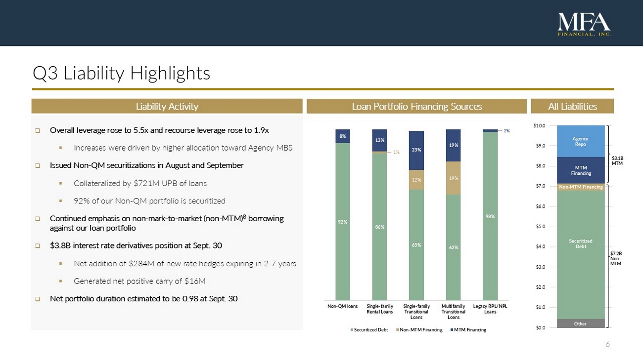 5 □ Acquired $1.2B of residential mortgage loans and securities, growing investment portfolio by over $400M to $11.2B ▪ Purchased $453M of Non - QM loans ▪ Added $473M of Agency MBS ▪ Lima One originated $260M 6 of new business purpose loans □ Portfolio runoff and asset sales of $755M ▪ Sold $66M of newly - originated SFR loans ▪ Sold $15M of delinquent Transitional loans and $27M of REO properties □ Loan portfolio 60+ day delinquency rate declined to 6.8% from 7.3% at June 30 □ Current rate environment continues to provide opportunities to add new assets at attractive yields ▪ Average coupon on all loans acquired in Q3 was 8.3% ▪ Incremental ROE for new investments expected to be mid - teens Q Q3 Portfolio Highlights Investment Portfolio at Sept. 30 7 Q3 Portfolio Activity Non - QM Loans $5.1B Agency MBS $2.2B Other $0.3B Single - family Transitional Loans $0.8B Single - family Rental Loans $1.2B Multifamily Transitional Loans $0.6B Legacy RPL/NPL $1.0B