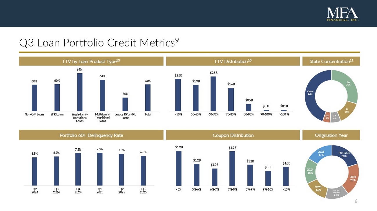8 $1.9B $1.2B $1.0B $1.9B $1.2B $0.8B $1.0B <5% 5%-6% 6%-7% 7%-8% 8%-9% 9%-10% >10% Q3 202 2 Financial Snapshot Q3 Loan Portfolio Credit Metrics 9 60% 60% 69% 64% 50% 60% Non-QM Loans SFR Loans Single-family Transitional Loans Multifamily Transitional Loans Legacy RPL/NPL Loans Total LTV by Loan Product Type 10 LTV Distribution 10 State Concentration 11 Portfolio 60+ Delinquency Rate Coupon Distribution Origination Year $2.3B $1.9B $2.5B $1.6B $0.5B $0.1B $0.1B <50% 50-60% 60-70% 70-80% 80-90% 90-100% >100 % 6.5% 6.7% 7.5% 7.5% 7.3% 6.8% Q2 2024 Q3 2024 Q4 2024 Q1 2025 Q2 2025 Q3 2025 CA 30% FL 15% TX 6% NY 5% Other 44% Pre - 2021 20% 2021 20% 2022 14% 2023 14% 2024 15% 2025 17%