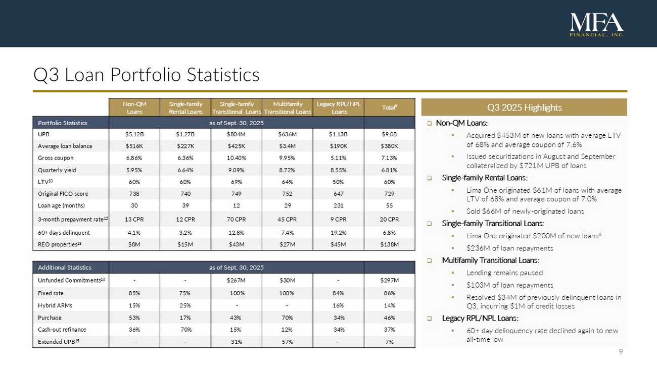 9 Q3 202 2 Financial Snapshot Q3 Loan Portfolio Statistics Total 9 Legacy RPL/NPL Loans Multifamily Transitional Loans Single - family Transitional Loans Single - family Rental Loans Non - QM Loans as of Sept. 30, 2025 Portfolio Statistics $9.0B $1.13B $636M $804M $1.27B $5.12B UPB $380K $190K $3.4M $425K $227K $516K Average loan balance 7.13% 5.11% 9.95% 10.40% 6.36% 6.86% Gross coupon 6.81% 8.55% 8.72% 9.09% 6.64% 5.95% Quarterly yield 60% 50% 64% 69% 60% 60% LTV 10 729 647 752 749 740 738 Original FICO score 55 231 29 12 39 30 Loan age (months) 20 CPR 9 CPR 45 CPR 70 CPR 12 CPR 13 CPR 3 - month prepayment rate 12 6.8% 19.2% 7.4% 12.8% 3.2% 4.1% 60+ days delinquent $138M $45M $27M $43M $15M $8M REO properties 13 as of Sept. 30, 2025 Additional Statistics $297M - $30M $267M - - Unfunded Commitments 14 86% 84% 100% 100% 75% 85% Fixed rate 14% 16% - - 25% 15% Hybrid ARMs 46% 34% 70% 43% 17% 53% Purchase 37% 34% 12% 15% 70% 36% Cash - out refinance 7% - 57% 31% - - Extended UPB 15 □ Non - QM Loans: ▪ Acquired $453M of new loans with average LTV of 68% and average coupon of 7.6% ▪ Issued securitizations in August and September collateralized by $721M UPB of loans □ Single - family Rental Loans: ▪ Lima One originated $61M of loans with average LTV of 68% and average coupon of 7.0% ▪ Sold $66M of newly - originated loans □ Single - family Transitional Loans: ▪ Lima One originated $200M of new loans 6 ▪ $236M of loan repayments □ Multifamily Transitional Loans: ▪ L ending remains paused ▪ $103M of loan repayments ▪ Resolved $34M of previously delinquent loans in Q3, incurring $1M of credit losses □ Legacy RPL/NPL Loans: ▪ 60+ day delinquency rate declined again to new all - time low Q3 2025 Highlights