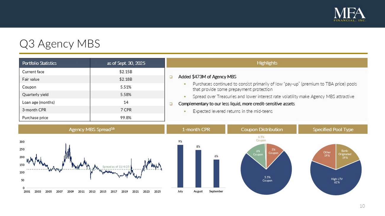 10 0 50 100 150 200 250 300 2001 2003 2005 2007 2009 2011 2013 2015 2017 2019 2021 2023 2025 Q3 202 2 Financial Snapshot Q3 Agency MBS □ Added $ 473 M of Agency MBS ▪ Purchases continued to consist primarily of low “pay - up” (premium to TBA price) pools that provide some prepayment protection ▪ Spread over Treasuries and lower interest rate volatility make Agency MBS attractive □ Complementary to our less liquid, more credit - sensitive assets ▪ Expected levered returns in the mid - teens Highlights as of Sept. 30, 2025 Portfolio Statistics $2.15B Current face $2.18B Fair value 5.51% Coupon 5.58% Quarterly yield 14 Loan age (months) 7 CPR 3 - month CPR 99.8% Purchase price Agency MBS Spread 16 1 - month CPR Coupon Distribution 5% Coupon 5.5% Coupon 6% Coupon 6.5% Coupon 9% 8% 6% July August September Specified Pool Type Bank - Originated 19% High LTV 62% Other 19% Spread as of 11/4/25
