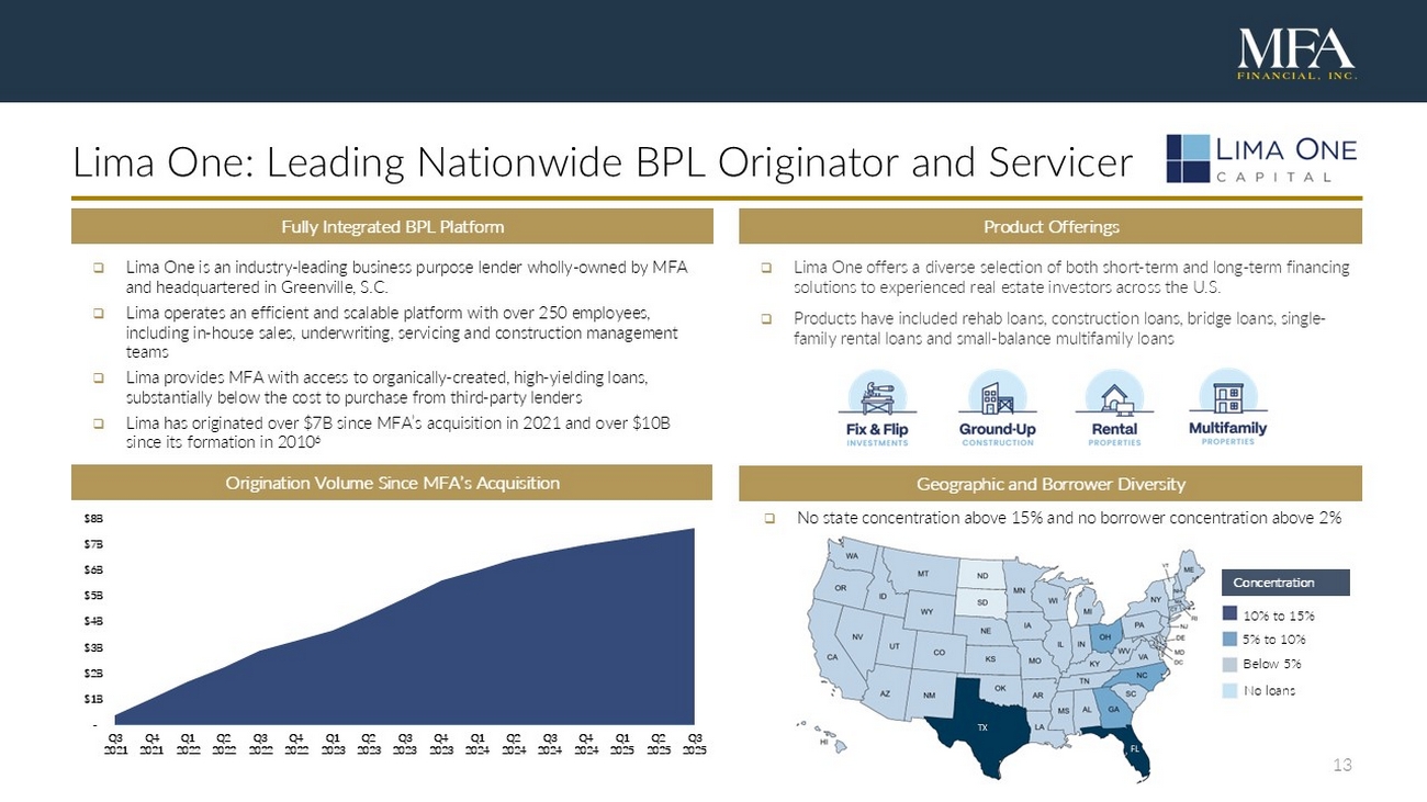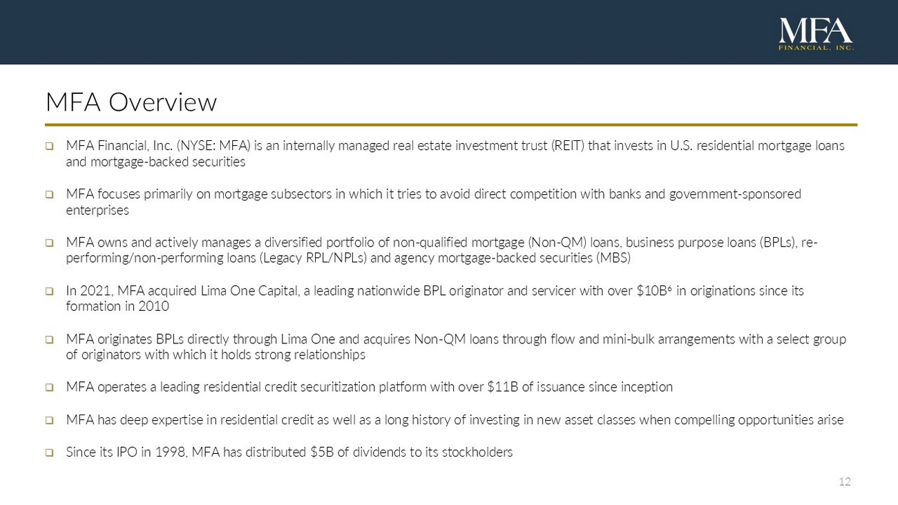 12 MFA Overview □ MFA Financial, Inc. (NYSE: MFA) is an internally managed real estate investment trust (REIT) that invests in U.S. residential mo rtgage loans and mortgage - backed securities □ MFA focuses primarily on mortgage subsectors in which it tries to avoid direct competition with banks and government - sponsored enterprises □ MFA owns and actively manages a diversified portfolio of non - qualified mortgage (Non - QM) loans, business purpose loans (BPLs), r e - performing/non - performing loans (Legacy RPL/NPLs) and agency mortgage - backed securities (MBS) □ In 2021, MFA acquired Lima One Capital, a leading nationwide BPL originator and servicer with over $10B 6 in originations since its formation in 2010 □ MFA originates BPLs directly through Lima One and acquires Non - QM loans through flow and mini - bulk arrangements with a select gr oup of originators with which it holds strong relationships □ MFA operates a leading residential credit securitization platform with over $11B of issuance since inception □ MFA has deep expertise in residential credit as well as a long history of investing in new asset classes when compelling oppo rtu nities arise □ Since its IPO in 1998, MFA has distributed $ 5B of dividends to its stockholders