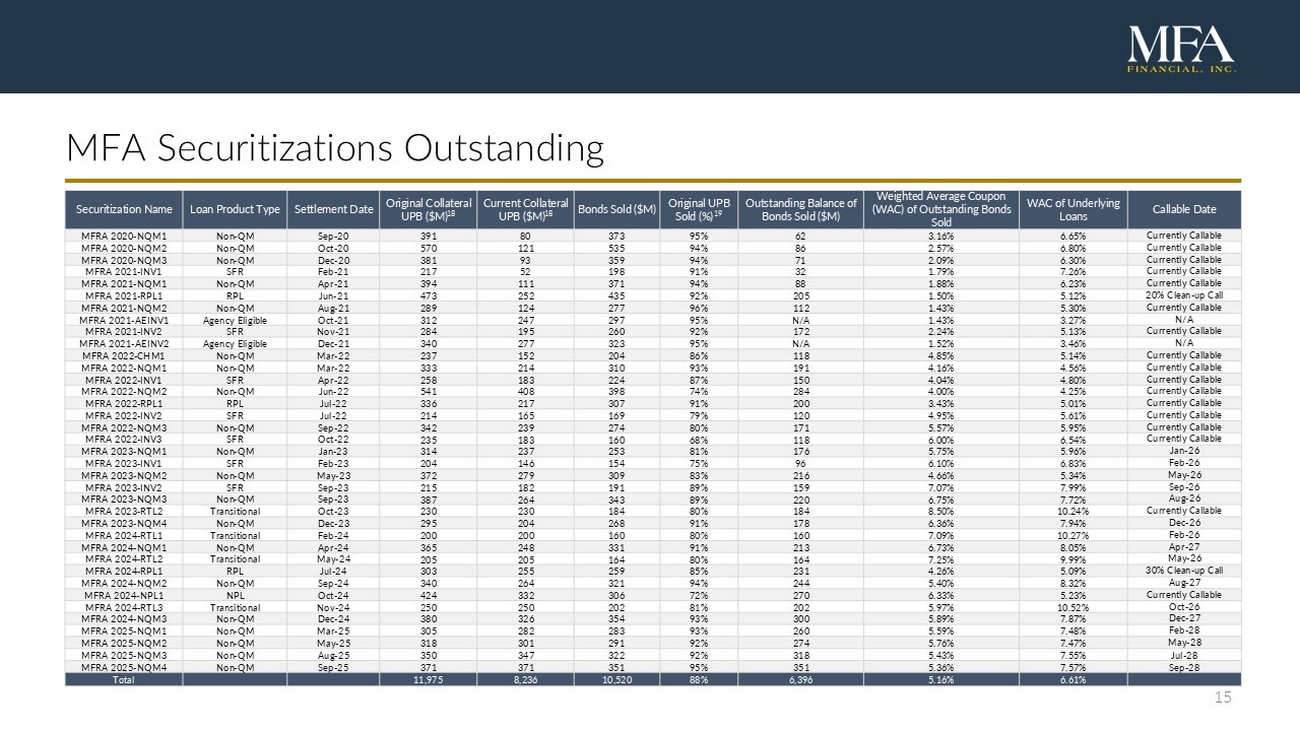 15 MFA Securitizations Outstanding Callable Date WAC of Underlying Loans Weighted Average Coupon (WAC) of Outstanding Bonds Sold Outstanding Balance of Bonds Sold ($M) Original UPB Sold (%) 19 Bonds Sold ($M) Current Collateral UPB ($M) 18 Original Collateral UPB ($M) 18 Settlement Date Loan Product Type Securitization Name Currently Callable 6.65% 3.16% 62 95% 373 80 391 Sep - 20 Non - QM MFRA 2020 - NQM1 Currently Callable 6.80% 2.57% 86 94% 535 121 570 Oct - 20 Non - QM MFRA 2020 - NQM2 Currently Callable 6.30% 2.09% 71 94% 359 93 381 Dec - 20 Non - QM MFRA 2020 - NQM3 Currently Callable 7.26% 1.79% 32 91% 198 52 217 Feb - 21 SFR MFRA 2021 - INV1 Currently Callable 6.23% 1.88% 88 94% 371 111 394 Apr - 21 Non - QM MFRA 2021 - NQM1 20% Clean - up Call 5.12% 1.50% 205 92% 435 252 473 Jun - 21 RPL MFRA 2021 - RPL1 Currently Callable 5.30% 1.43% 112 96% 277 124 289 Aug - 21 Non - QM MFRA 2021 - NQM2 N/A 3.27% 1.43% N/A 95% 297 247 312 Oct - 21 Agency Eligible MFRA 2021 - AEINV1 Currently Callable 5.13% 2.24% 172 92% 260 195 284 Nov - 21 SFR MFRA 2021 - INV2 N/A 3.46% 1.52% N/A 95% 323 277 340 Dec - 21 Agency Eligible MFRA 2021 - AEINV2 Currently Callable 5.14% 4.85% 118 86% 204 152 237 Mar - 22 Non - QM MFRA 2022 - CHM1 Currently Callable 4.56% 4.16% 191 93% 310 214 333 Mar - 22 Non - QM MFRA 2022 - NQM1 Currently Callable 4.80% 4.04% 150 87% 224 183 258 Apr - 22 SFR MFRA 2022 - INV1 Currently Callable 4.25% 4.00% 284 74% 398 408 541 Jun - 22 Non - QM MFRA 2022 - NQM2 Currently Callable 5.01% 3.43% 200 91% 307 217 336 Jul - 22 RPL MFRA 2022 - RPL1 Currently Callable 5.61% 4.95% 120 79% 169 165 214 Jul - 22 SFR MFRA 2022 - INV2 Currently Callable 5.95% 5.57% 171 80% 274 239 342 Sep - 22 Non - QM MFRA 2022 - NQM3 Currently Callable 6.54% 6.00% 118 68% 160 183 235 Oct - 22 SFR MFRA 2022 - INV3 Jan - 26 5.96% 5.75% 176 81% 253 237 314 Jan - 23 Non - QM MFRA 2023 - NQM1 Feb - 26 6.83% 6.10% 96 75% 154 146 204 Feb - 23 SFR MFRA 2023 - INV1 May - 26 5.34% 4.66% 216 83% 309 279 372 May - 23 Non - QM MFRA 2023 - NQM2 Sep - 26 7.99% 7.07% 159 89% 191 182 215 Sep - 23 SFR MFRA 2023 - INV2 Aug - 26 7.72% 6.75% 220 89% 343 264 387 Sep - 23 Non - QM MFRA 2023 - NQM3 Currently Callable 10.24% 8.50% 184 80% 184 230 230 Oct - 23 Transitional MFRA 2023 - RTL2 Dec - 26 7.94% 6.36% 178 91% 268 204 295 Dec - 23 Non - QM MFRA 2023 - NQM4 Feb - 26 10.27% 7.09% 160 80% 160 200 200 Feb - 24 Transitional MFRA 2024 - RTL1 Apr - 27 8.05% 6.73% 213 91% 331 248 365 Apr - 24 Non - QM MFRA 2024 - NQM1 May - 26 9.99% 7.25% 164 80% 164 205 205 May - 24 Transitional MFRA 2024 - RTL2 30% Clean - up Call 5.09% 4.26% 231 85% 259 255 303 Jul - 24 RPL MFRA 2024 - RPL1 Aug - 27 8.32% 5.40% 244 94% 321 264 340 Sep - 24 Non - QM MFRA 2024 - NQM2 Currently Callable 5.23% 6.33% 270 72% 306 332 424 Oct - 24 NPL MFRA 2024 - NPL1 Oct - 26 10.52% 5.97% 202 81% 202 250 250 Nov - 24 Transitional MFRA 2024 - RTL3 Dec - 27 7.87% 5.89% 300 93% 354 326 380 Dec - 24 Non - QM MFRA 2024 - NQM3 Feb - 28 7.48% 5.59% 260 93% 283 282 305 Mar - 25 Non - QM MFRA 2025 - NQM1 May - 28 7.47% 5.76% 274 92% 291 301 318 May - 25 Non - QM MFRA 2025 - NQM2 Jul - 28 7.55% 5.43% 318 92% 322 347 350 Aug - 25 Non - QM MFRA 2025 - NQM3 Sep - 28 7.57% 5.36% 351 95% 351 371 371 Sep - 25 Non - QM MFRA 2025 - NQM4 6.61% 5.16% 6,396 88% 10,520 8,236 11,975 Total