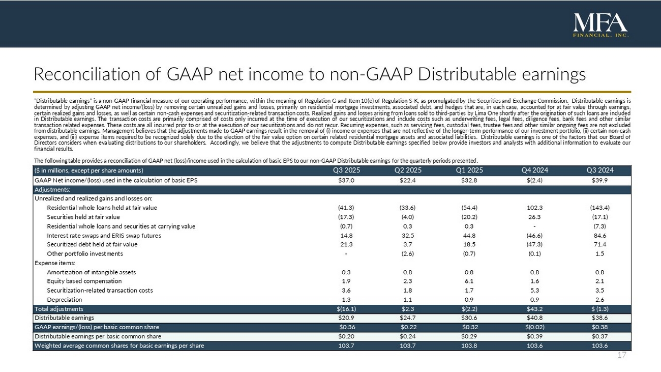 17 “ Distributable earnings” is a non - GAAP financial measure of our operating performance, within the meaning of Regulation G and Item 10 (e) of Regulation S - K, as promulgated by the Securities and Exchange Commission . Distributable earnings is determined by adjusting GAAP net income/(loss) by removing certain unrealized gains and losses, primarily on residential mortgage investments, associated debt, and hedges that are, in each case, accounted for at fair value through earnings, certain realized gains and losses, as well as certain non - cash expenses and securitization - related transaction costs . Realized gains and losses arising from loans sold to third - parties by Lima One shortly after the origination of such loans are included in Distributable earnings . The transaction costs are primarily comprised of costs only incurred at the time of execution of our securitizations and include costs such as underwriting fees, legal fees, diligence fees, bank fees and other similar transaction related expenses . These costs are all incurred prior to or at the execution of our securitizations and do not recur . Recurring expenses, such as servicing fees, custodial fees, trustee fees and other similar ongoing fees are not excluded from distributable earnings . Management believes that the adjustments made to GAAP earnings result in the removal of ( i ) income or expenses that are not reflective of the longer - term performance of our investment portfolio, (ii) certain non - cash expenses, and (iii) expense items required to be recognized solely due to the election of the fair value option on certain related residential mortgage assets and associated liabilities . Distributable earnings is one of the factors that our Board of Directors considers when evaluating distributions to our shareholders . Accordingly, we believe that the adjustments to compute Distributable earnings specified below provide investors and analysts with additional information to evaluate our financial results . The following table provides a reconciliation of GAAP net (loss)/income used in the calculation of basic EPS to our non - GAAP Distributable earnings for the quarterly periods presented . Q3 202 4 Q4 202 4 Q1 202 5 Q2 202 5 Q3 202 5 ( $ i n m illions, e xcept p er s hare a mounts) $39.9 $(2.4) $32.8 $22.4 $37.0 GAAP Net income/(loss) used in the calculation of basic EPS Adjustments: Unrealized and realized gains and losses on: (143.4) 102.3 (54.4) (33.6) (41.3) Residential whole loans held at fair value (17.1) 26.3 (20.2) (4.0) (17.3) Securities held at fair value (7.3) - 0.3 0.3 (0.7) Residential whole loans and securities at carrying value 84.6 (46.6) 44.8 32.5 14.8 Interest rate swaps and ERIS swap futures 71.4 (47.3) 18.5 3.7 21.3 Securitized debt held at fair value 1.5 (0.1) (0.7) (2.6) - Other portfolio investments Expense items: 0.8 0.8 0.8 0.8 0.3 Amortization of intangible assets 2.1 1.6 6.1 2.3 1.9 Equity based compensation 3.5 5.3 1.7 1.8 3.6 Securitization - related transaction costs 2.6 0.9 0.9 1.1 1.3 Depreciation $ (1.3) $43.2 $(2.2) $2.3 $(16.1) Total adjustments $38.6 $40.8 $30.6 $24.7 $20.9 Distributable earnings $0.38 $(0.02) $0.32 $0.22 $0.36 GAAP earnings/(loss) per basic common share $0.37 $0.39 $0.29 $0.24 $0.20 Distributable earnings per basic common share 103.6 103.6 103.8 103.7 103.7 Weighted average common shares for basic earnings per share Reconciliation of GAAP net income to non - GAAP Distributable earnings