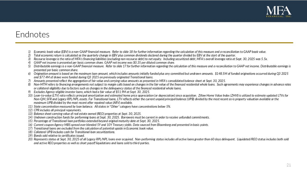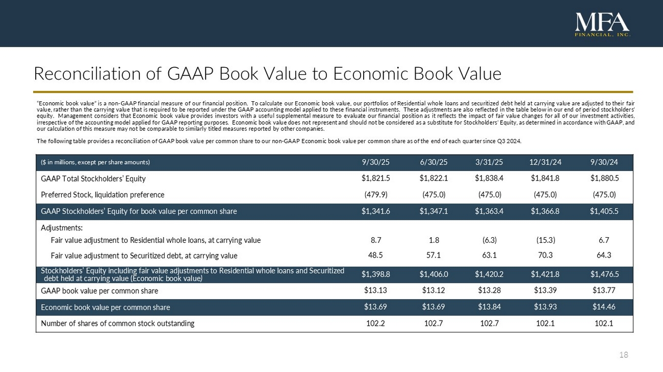 18 Reconciliation of GAAP Book Value to Economic Book Value “Economic book value” is a non - GAAP financial measure of our financial position . To calculate our Economic book value, our portfolios of Residential whole loans and securitized debt held at carrying value are adjusted to their fair value, rather than the carrying value that is required to be reported under the GAAP accounting model applied to these financial instruments . These adjustments are also reflected in the table below in our end of period stockholders’ equity . Management considers that Economic book value provides investors with a useful supplemental measure to evaluate our financial position as it reflects the impact of fair value changes for all of our investment activities, irrespective of the accounting model applied for GAAP reporting purposes . Economic book value does not represent and should not be considered as a substitute for Stockholders’ Equity, as determined in accordance with GAAP, and our calculation of this measure may not be comparable to similarly titled measures reported by other companies . The following table provides a reconciliation of GAAP book value per common share to our non - GAAP Economic book value per common share as of the end of each quarter since Q 3 2024 . 9/30/24 12/31/24 3/31/25 6/30/25 9/30/25 ($ i n millions, except per share amounts) $1,880.5 $1,841.8 $1,838.4 $1,822.1 $1,821.5 GAAP Total Stockholders’ Equity (475.0) (475.0) (475.0) (475.0) (479.9) Preferred Stock, liquidation preference $1,405.5 $1,366.8 $1,363.4 $1,347.1 $1,341.6 GAAP Stockholders’ Equity for book value per common share Adjustments: 6.7 (15.3) (6.3) 1.8 8.7 Fair value adjustment to Residential whole loans, at carrying value 64.3 70.3 63.1 57.1 48.5 Fair value adjustment to Securitized debt, at carrying value $1,476.5 $1,421.8 $1,420.2 $1,406.0 $1,398.8 Stockholders’ Equity including fair value adjustments to Residential whole loans and Securitized debt held at carrying value (Economic book value ) $13.77 $13.39 $13.28 $13.12 $13.13 GAAP book value per common share $14.46 $13.93 $13.84 $13.69 $13.69 Economic book value per common share 102.1 102.1 102.7 102.7 102.2 Number of shares of common stock outstanding