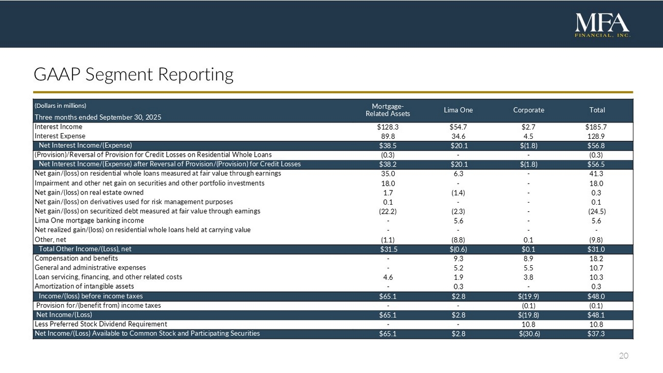20 GAAP Segment Reporting Total d Corporate Lima One Mortgage - Related Assets (Dollars in m illions) Three months ended September 30, 2025 $185.7 1 $2.7 $54.7 $128.3 Interest Income 128.9 1 4.5 34.6 89.8 Interest Expense $56.8 1 $(1.8) $20.1 $38.5 Net Interest Income /(Expense) (0.3) 1 - - (0.3) (Provision)/Reversal of Provision for Credit Losses on Residential Whole Loans $56.5 4 $(1.8) $20.1 $38.2 Net Interest Income /(Expense) after Reversal of Provision/( Provision ) for Credit Losses 41.3 1 - 6.3 35.0 Net gain/(loss) on residential whole loans measured at fair value through earnings 18.0 1 - - 18.0 Impairment and other net gain on securities and other portfolio investments 0.3 1 - (1.4) 1.7 Net gain /(loss) on real estate owned 0.1 1 - - 0.1 Net gain/(loss) on derivatives used for risk management purposes (24.5) 1 - (2.3) (22.2) Net gain/(loss) on securitized debt measured at fair value through earnings 5.6 1 - 5.6 - Lima One mortgage banking income - 1 - - - Net realized gain/(loss) on residential whole loans held at carrying value (9.8) 1 0.1 (8.8) (1.1) Other, net $31.0 1 $0.1 $(0.6) $31.5 Total Other Income/(Loss) , net 18.2 1 8.9 9.3 - Compensation and benefits 10.7 1 5.5 5.2 - General and administrative expenses 10.3 1 3.8 1.9 4.6 Loan servicing, financing, and other related costs 0.3 1 - 0.3 - Amortization of intangible assets $48.0 1 $(19.9) $2.8 $65.1 Income/(loss) before income taxes (0.1) 1 (0.1) - - Provision for/(benefit from) income taxes $48.1 1 $(19.8) $2.8 $65.1 Net Income/(Loss) 10.8 1 10.8 - - Less Preferred Stock Dividend Requirement $37.3 1 $(30.6) $2.8 $65.1 Net Income/( Loss ) Available to Common Stock and Participating Securities